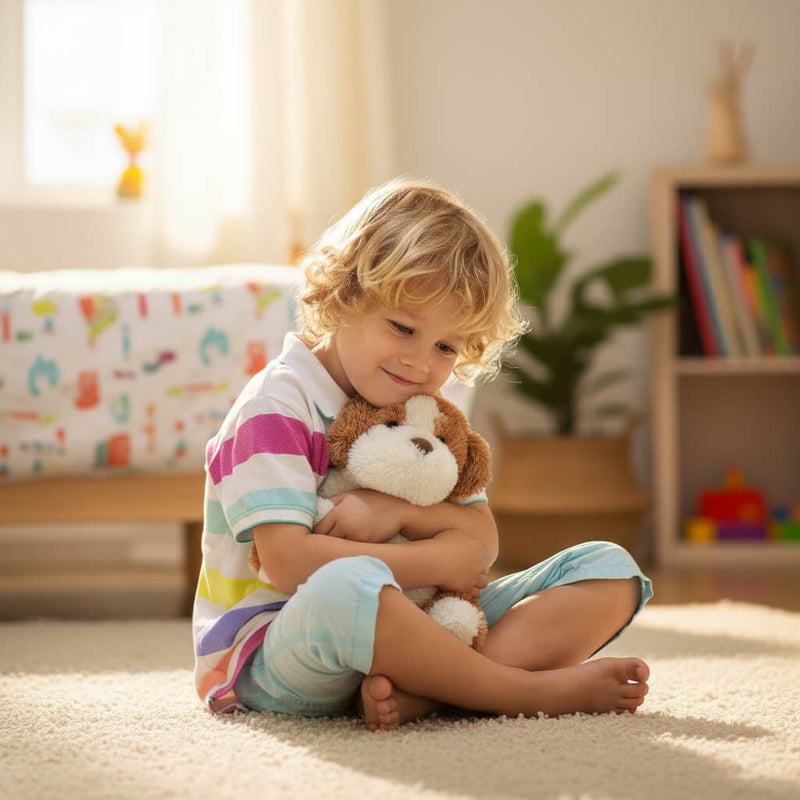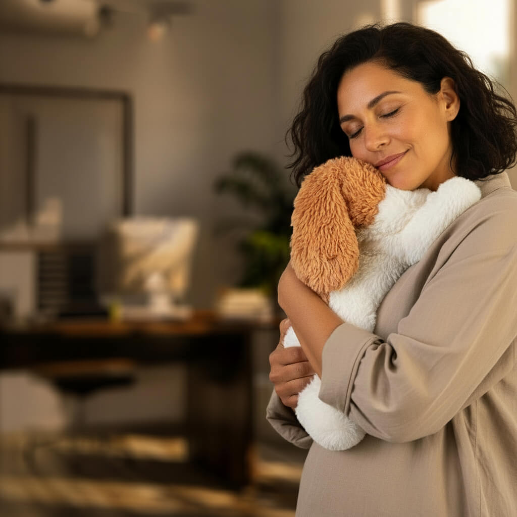 Ik had zelf ervaren hoe rustgevend diepe druk kan zijn—die zachte, constante druk die je zenuwstelsel kalmeert en helpt ontspannen. Maar een deken van 7 kilo voelde te overweldigend, te onpraktisch. Ik wilde iets wat je kon vasthouden, meenemen naar de bank of op reis, en dat ook echt uitnodigde om te knuffelen.